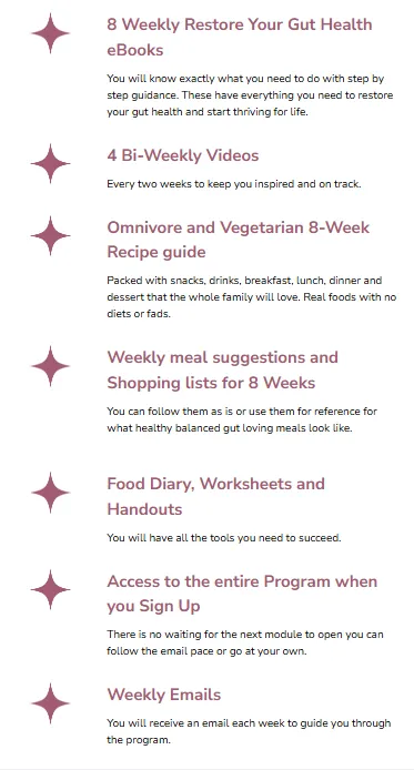 My signature 8-week Restore Your Gut Health Online Program, easy to follow guides and takes about an hour per week of your time (Value $1997)